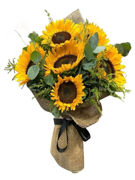 6 adet ayçiçeği okaliptus yaprakları ile birlikte hasır tela ile süslenmiştir.